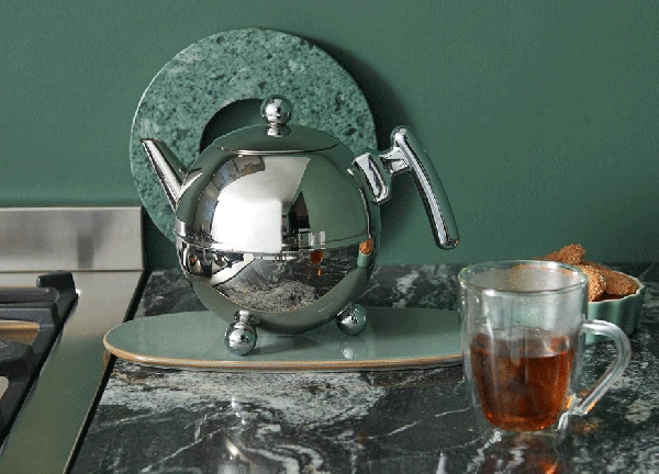 Aus hochwertigem verchromten Edelstahl gefertigt und doppelwandig isolierter Konstruktion bleibt in der runden Teekanne Duet Bella Ronde von Bredemeijer der Tee besonders lange heiß und geschmackvoll. Der ergonomische Beschlag sowie die spezielle Form der Tülle ermöglichen ein hervorragendes Einschenken des Tees ohne Tropfen. Durch das isolierende Material werden die Beschläge allenfalls handwarm. Zudem bürgen die verwendeten hochwertigen Materialien für eine lange Lebensdauer. Zusätzlich besticht die Teekanne durch ihre elegante Schlichtheit und ist schon jahrelang das beliebteste Produkt aus dem Bredemeijer-Angebot. Dazu ist ein passender Dauerfilter aus mikrofeinem Edelstahlgewebe erhältlich – dieser passt genormt auf alle doppelwandigen Teekannen, schließt die Kanne ab und der Deckel den Filter, so dass fast keine Wärme verloren geht.