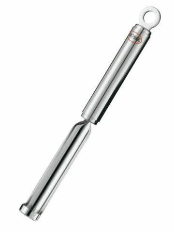 Fruchtentkerner von Rösle. Die einleuchtende Idee zum Aushöhlen von Obst: Die gleichmäßigen, nicht zu kleinen Zacken lassen sich leicht eindrehen, und die glatte Lauffläche verhindert eine weitergehende Beschädigung der Frucht. Vor allem das Kerngehäuse von Äpfeln kann dadurch leicht entfernt werden.