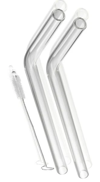 Im Set werden vier gebogene, transparente Glastrinkhalme mit 23 cm Länge und einer passenden Reinigungsbürste geliefert. Alle Trinkhalme sind hitzebeständig, geschmacksneutral und spülmaschinengeeignet.