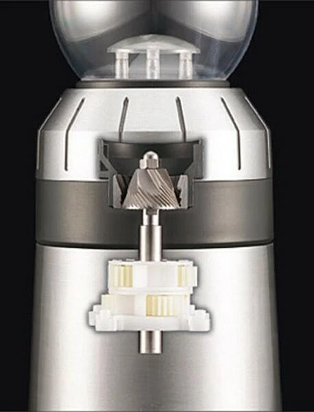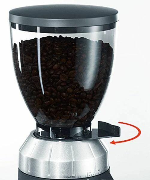 auf Abruf direkt in den Siebträger gemahlen werden. Das Außengehäuse der Kaffeemühle besteht aus robustem Aluminiumdruckguß.