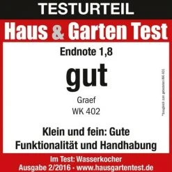 Graef Wasserkocher WK 403, 1 Liter. Klein und kompakt, so kommt der Wasserkocher WK 403 von Graef daher. Mit seiner Füllmenge von einem Liter (=8 Tassen) ist er ideal für kleinere Haushalte oder für das energiesparende Aufkochen geringerer Wassermengen.