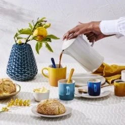 Le Creuset sind auch die Becher besonders leicht zu reinigen und spülmaschinenfest. Steinzeug ist, wie Porzellan, feinkeramisch und gehört zu der qualitativ hochwertigen Kategorie dichter Tonwaren. Im Gegensatz zum namensähnlichen Steingut hat Steinzeug eine deutlich bessere Beständigkeit, Festigkeit und Dichtigkeit des Materials. Die hohen Brenntemperaturen von bis zu 1300 Grad Celsius und die geringe Porosität gewährleisten eine dauerhafte Beanspruchung ohne Glasurrisse.