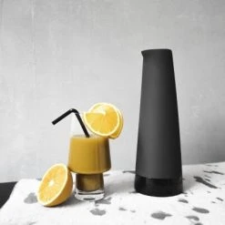 Karaffe aus terrakotta. Die Karaffe aus schwarz-glasiertem Terrakotta hält Flüssigkeiten lange kühl.