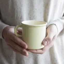 Riess Becher aus Emaille in pastell-gelb. Trinkbecher mit Griff und Bördelrand aus Emaille, ideal für Tee, Kaffee und andere Heiß- oder Kaltgetränke. Warme Getränke können direkt in der Tasse auf dem Herd erwärmt werden.