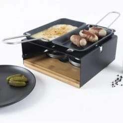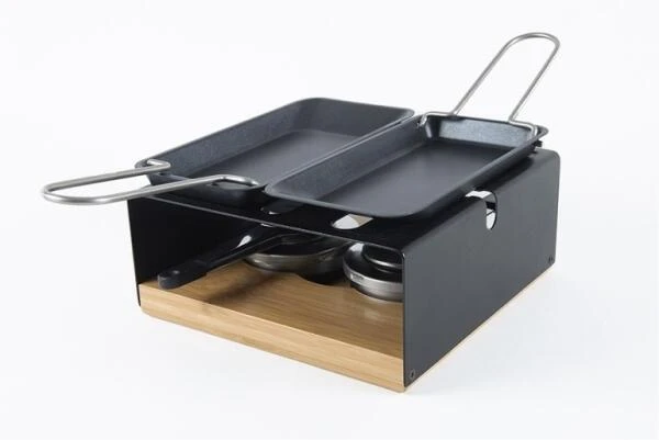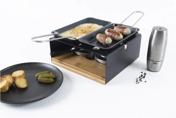 Raclette oder Warmhalteplatte einsetzbar. Mit 2 Pfännchen, 2 Holzspachtel sowie 2 Pasten-Sicherheitsbrenner.