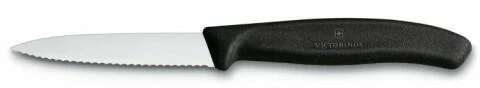 Gemüsemesser mit Wellenschliff, Mittelspitz, 8 cm, schwarz. Das perfekte Messer zum Schälen, Schneiden und Würfeln. Made in Switzerland!