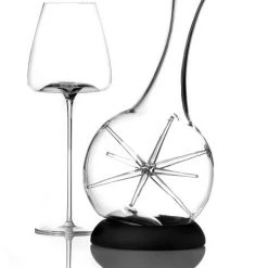Durch die filigranen Strahlen des zentralen Sterns wird der servierte Wein auf eine einmalig sanfte Art zur Weiterentwicklung animiert. Während des Schwenkvorgangs wird schonend ein feiner Sauerstofffilm unter den Wein gehoben und in ihm integriert. Dieser sorgt dafür, dass sich der Wein aus sich selbst heraus und nicht nur, wie bei anderen Karaffen, an der Oberfläche zu entwickeln beginnt. Durch das für diesen Dekanter verwendete Borosilikatglas, welches über eine sehr glatte Oberfläche verfügt, hat man den höchst angenehmen Effekt, dass die Aromenmoleküle nicht aus dem Wein geschleudert werden, sondern sich in der Folge komplett im Weinglas präsentieren dürfen. Der belüftete Wein wird enorm ausgewogen, stimmig und in seiner Mitte befindlich.